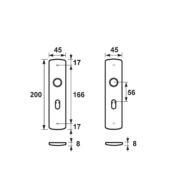 Toepassing: Sleutelgat afstand van 56mm Geschikt voor: Deuren met Sleutelgat Voorzien van: Kunststof basisplaat met Aluminium klikschild Geen bevestigingspunten in het zicht Afmeting: 200x45x8mm Materiaal: Aluminium F1 Geslepen Schroefadvies: 4,0x20mm Artikelnummer: 6210-30-11/56E Exclusief deurkruk en patentbouten (zie toebehoren)