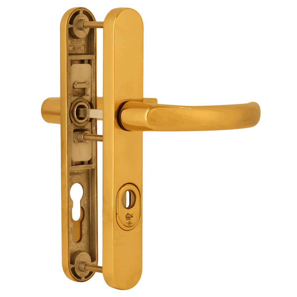 Dieckmann Smaldeurbeslag met Kerntrekbeveiliging D2007M/045 KR/KR MESSING PC92 DD:49-55mm SKG*** Dieckmann Smaldeurbeslag met Kerntrekbeveiliging D2007M/045 KR/KR MESSING PC92 DD:49-55mm SKG*** is voorzien van een verende Kerntrekbeveiliging die verstelbaar is voor Profielcilinders die 12-17mm uit de deur steken, ook is dit Veiligheidsbeslag voorzien van een kruk vast op schild die geveerd wordt in het binnenschild, dit voorkomt een hangende deurkruk. Dieckmann Smaldeurbeslag met Kerntrekbeveiliging is speciaal ontwikkeld voor situaties waar weinig montageruimte beschikbaar is zoals: Kunststof en metalen deuren of Houten deuren met opliggende glaslatten. Dieckmann Smaldeurbeslag met Kerntrekbeveiliging D2007M/045 KR/KR MESSING PC92 DD:49-55mm SKG*** heeft een fraai afgerond design en is vervaardigd uit hoogwaardig Roestvaststaal met een messing PVD coating, deze PVD coating is veel minder gevoelig voor corrosie dan massief messing. Wanneer u niet precies weet of dit type veiligheidsbeslag past kijk dan op: http://www.kerntrekbeveiliging.eu/anti-kerntrekbeslag-opmeten/