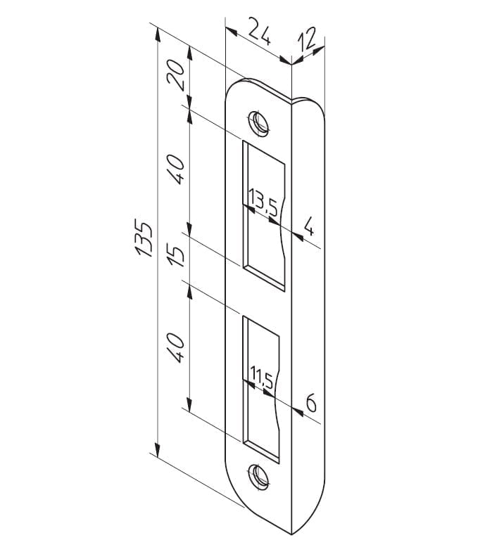 Toepassing: NEMEF 1264 Toiletsloten, NEMEF 1266 Klaviersloten en NEMEF 1269 Cilindersloten. Din Draairichting: Din Links In de sluitplaat staat RS geslagen. Dat is ouderwetse rechtsluitende draairichting. Deze sluitplaten worden nu dus geleverd volgens de nieuwe DIN draairichtingen. Zie tekening bij de afbeeldingen. Type Sluitplaat: Hoeksluitplaat Afwerking: Verzinkt Type: HP1266/12 Artikelnummer: 9136690071