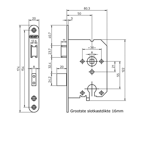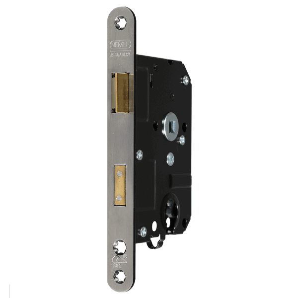 Het NEMF Veiligheidsslot 1279/17 kan worden toegepast te vervanging van de standaard 1200 Serie Binnendeursloten, waardoor deuren eenvoudig beveiligd kunnen worden met een geschikt Veiligheidsslot. NEMEF Veiligheidsslot 1279/17 Afgerond PC55 DM50 RVS Din RS SKG* (Excl. Sluitplaat) heeft een RVS Afgeronde Voorplaat, heeft een Doornmaat van 50mm en PC-Afstand van 55mm. Het NEMEF Veiligheidsslot 1279 kan eenvoudig van draairichting worden gewisseld.